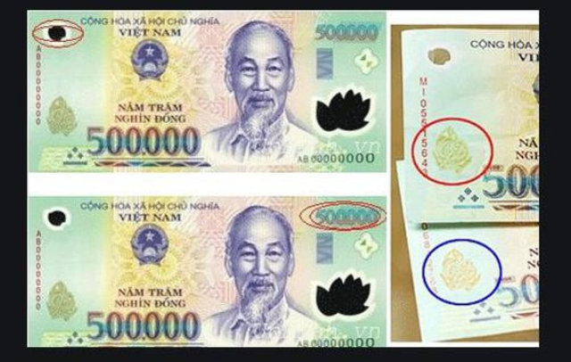 Cụ thể, tiền giả polymer mệnh giá 500.000 đồng (seri UF, DQ); 200.000 đồng (seri QH, KD) có đặc điểm nhận biết: Hình ảnh, hoa văn không sắc nét; hình định vị không khớp khít; mực đổi màu (OVI) được in giả cùng hình ảnh hoa văn mặt trước, không có hiệu ứng đổi màu như tiền thật; mảng ký tự siêu nhỏ là dải mực nhòe; cửa sổ lớn, cửa sổ nhỏ có định dạng không rõ ràng, không cân đối.