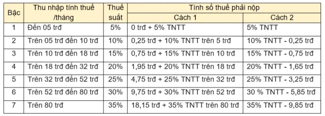 – Thuế suất mà người lao động phải chịu được tính tương ứng với phần thu nhập tính thuế theo tháng như sau:
